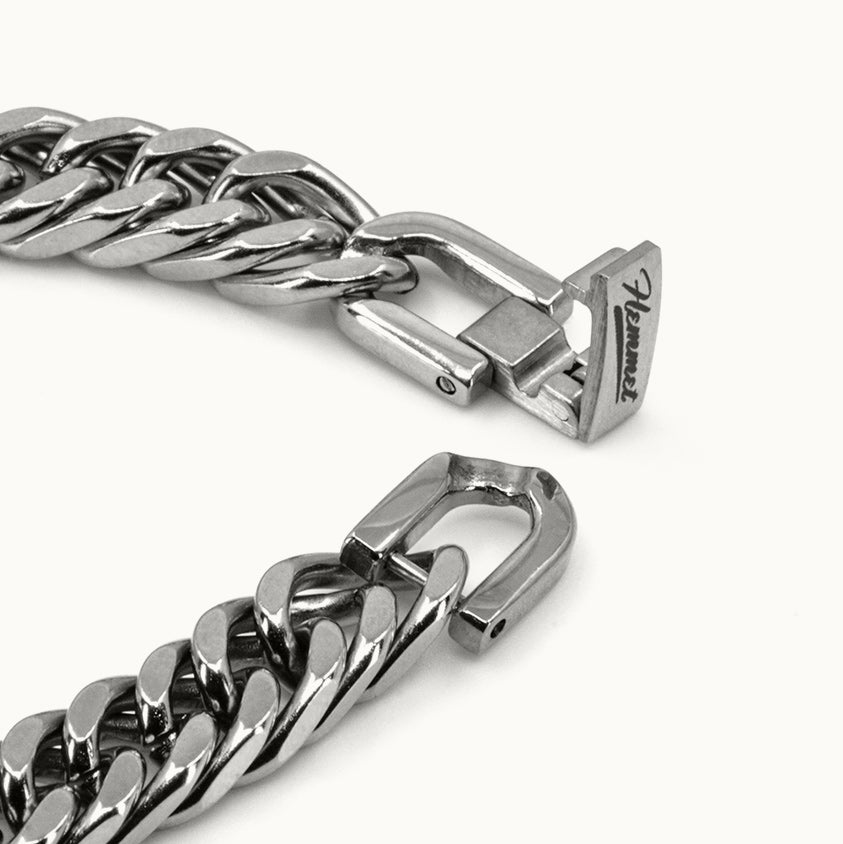 La chiusura a scatola, impreziosita dal logo Hemmet® inciso, è un dettaglio raffinato che esprime eleganza e unicità. Ogni maglia della catena è progettata per garantire comfort e resistenza, mentre il design audace e sofisticato conferisce un tocco distintivo a ogni look.